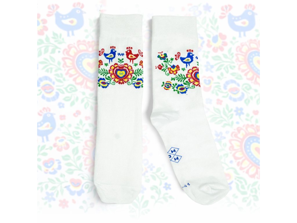 Tradiční folklorní vzorování na bílém bavlněném podkladu. Folklorní ponožky Moumou Cérka naladí každý tvůj krok do tónů tradice a folkloru. Nechť jsi každým krokem šťastnější!