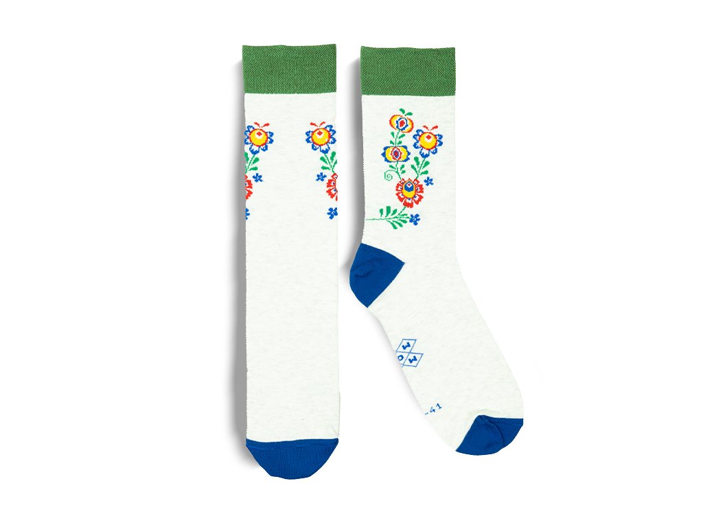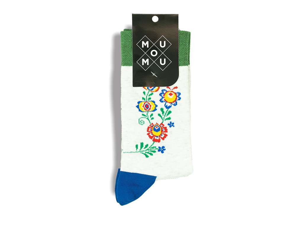 Tradiční folklorní vzorování na bílém bavlněném podkladu. Folklorní ponožky Moumou Cérka naladí každý tvůj krok do tónů tradice a folkloru. Nechť jsi každým krokem šťastnější!