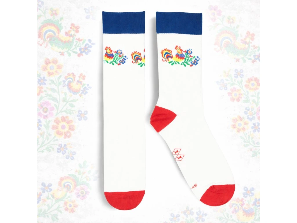 Tradiční folklorní vzorování kohůta na bílém bavlněném podkladu. Folklorní ponožky Moumou Verbuňk naladí každý tvůj krok do tónů tradice a folkloru. Nechť jsi každým krokem šťastnější!
