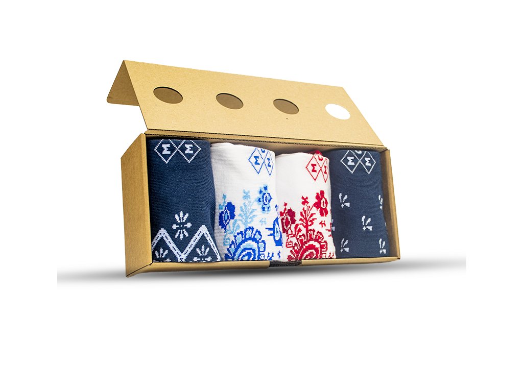 Folklorní dárek poskládaný ze čtyř párů ponožek. Čtyři páry kotníkových ponožek najdeš pod víkem v ručně vyráběném dárkovém setu. Folklorní set Hájek je set kotníkových ponožek v barevných variantách slováckých ponožek. Dárková kazeta i ponožky jsou vyrobeny v Česku na Slovácku.