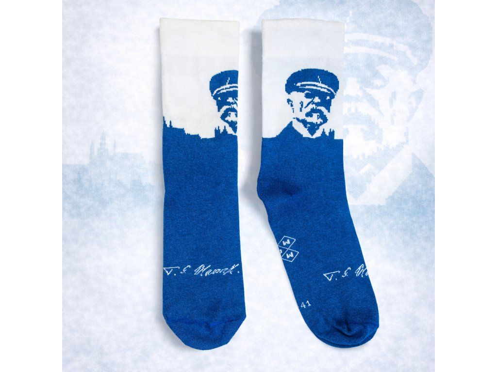 Jsme hrdí na svůj národ a proto jsme s radostí vytvořili kolekci, kde nás bude náš bývalý prezident reprezentovat každým krokem. Bavlněné ponožky a na nich Tomáš Garrigue Masaryk se siluetou Prahy.