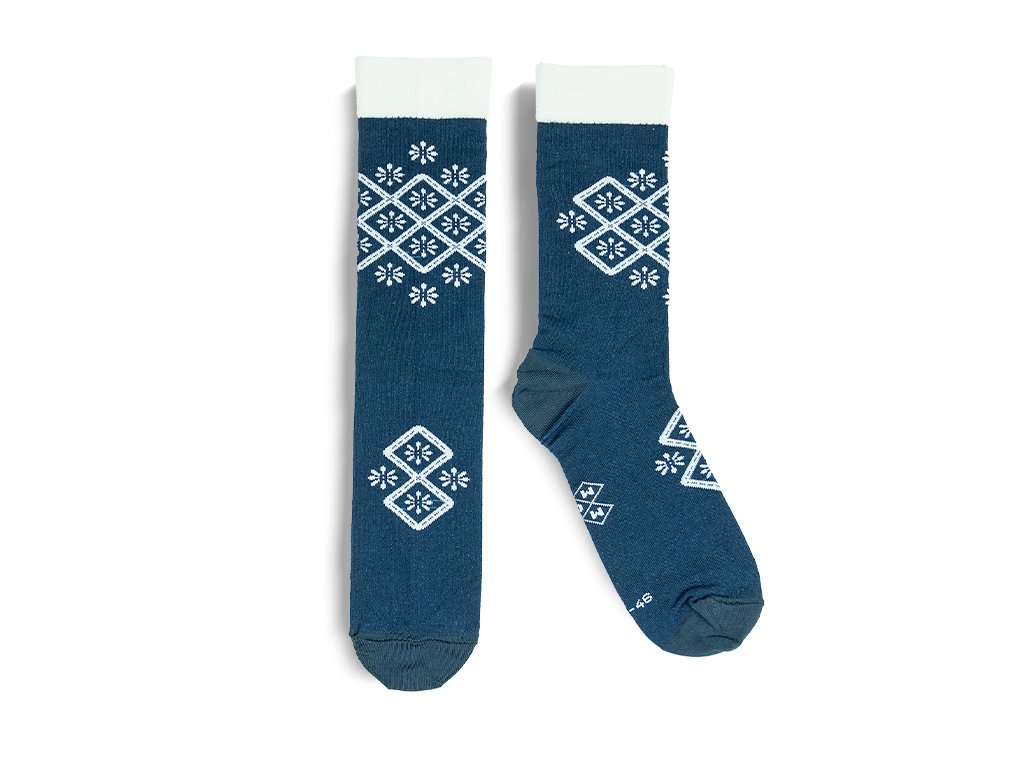 Snad nejznámější tradiční vzor naší země vetkán do ponožek z kvalitní česané bavlny. Při výrobě ponožek dbáme na ten nejpřesnější odstín temné modré, abychom co nejvíce vytvořili dojem tradičního modrotisku. Ponožky jsou vyrobené s láskou, na českých strojí a to v samotném srdci Slovácka.
