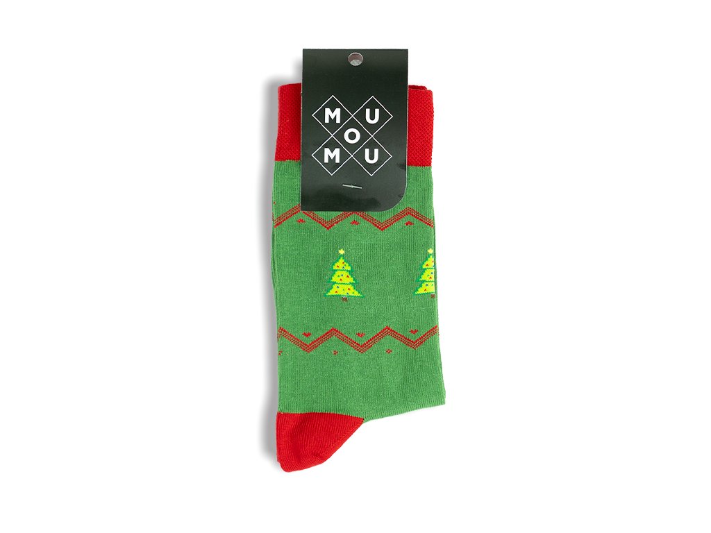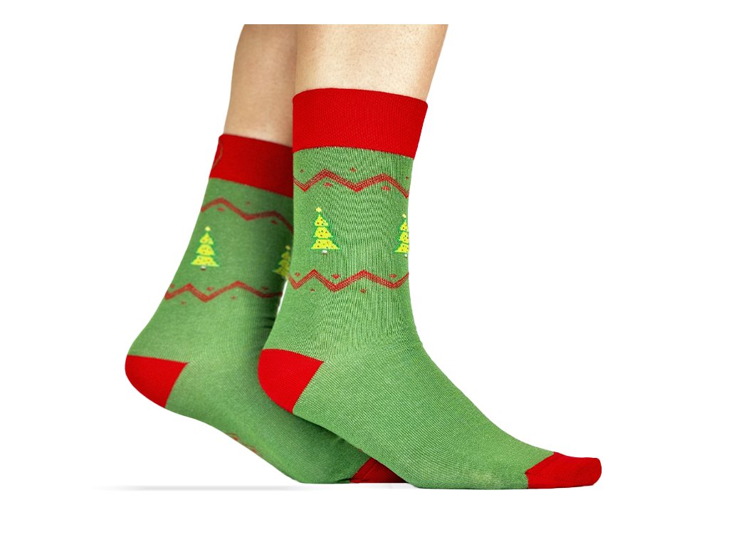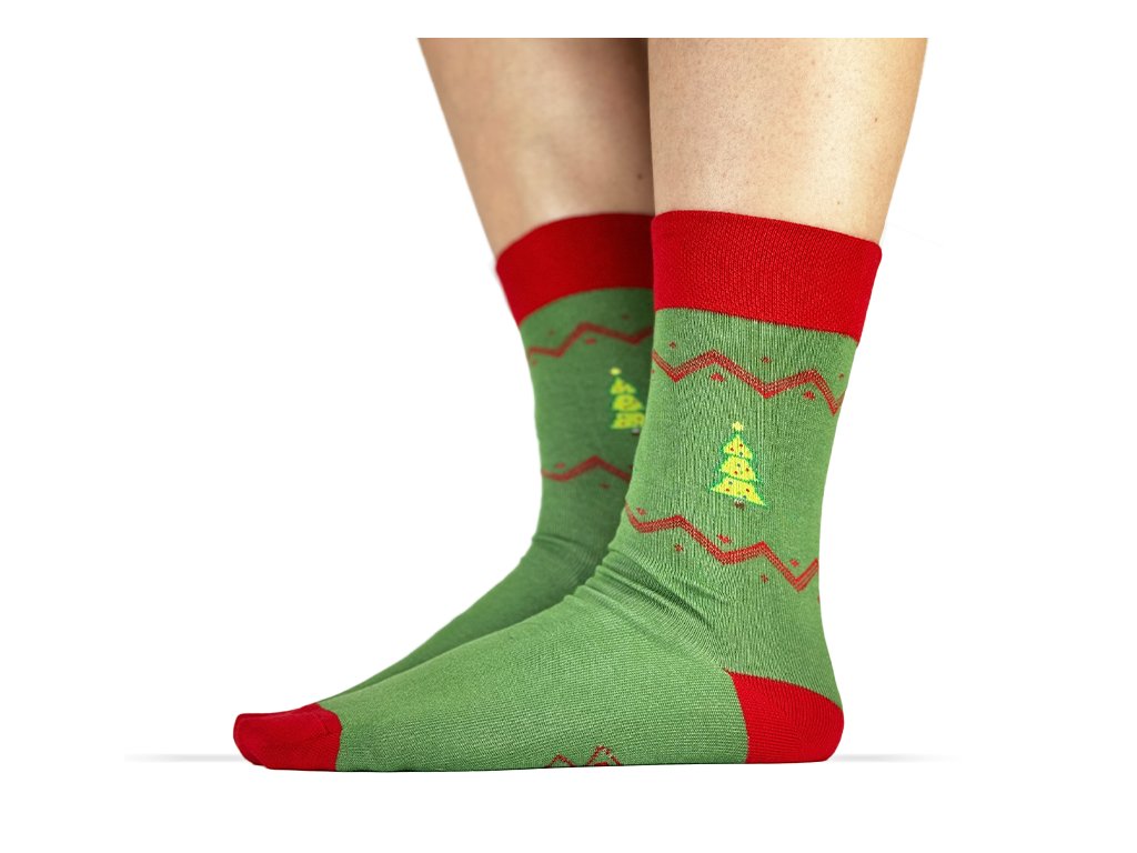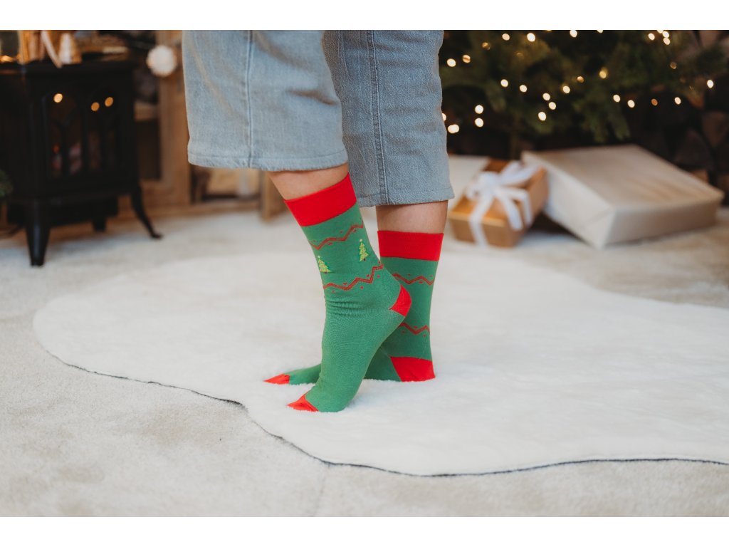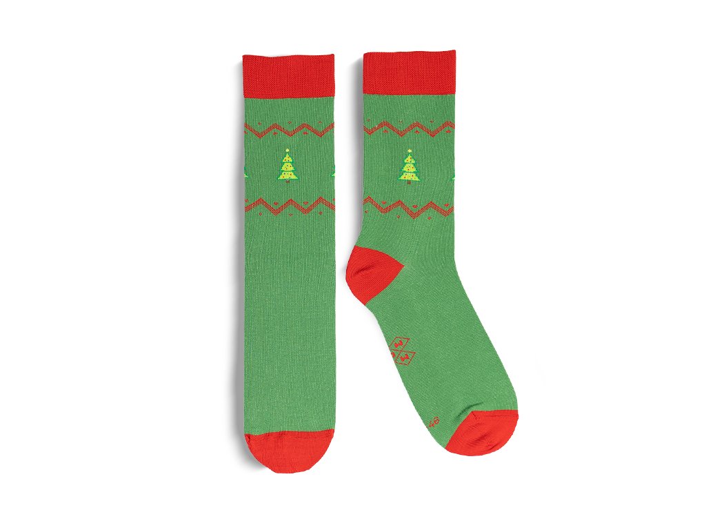 Vánoční ponožky plné českých vánoc. Také u vánočních ponožek vnímáme důležitost tradice a historii Česka. Decentní vzor vánočních symbolů a vánočních stromečků protkané kvalitní česanou bavlnou.