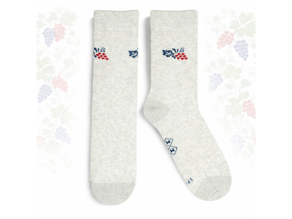 Ponožky pro vinaře! Do vinice, do sklépka, ale taky třeba k obleku. Decentní vzor vinné révy protkaný v kvalitní česané bavlně udrží nohy v teple ale zároveň také odvede pot a zajistí tak každodenní pohodlí. Vhodné jako dárek pro milovníky vína..
